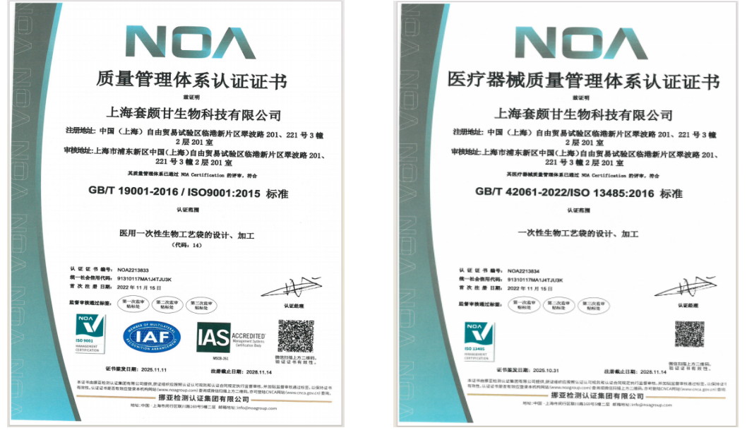 我公司依托 ISO13485、ISO9001 质量管理体系认证、药包材登记号 B20240001174、以及2000㎡ C+A 级 GMP 洁净车间和完善的标准化管理体系,形成了从研发、生产到质量控制的全流程保障。凭借稳固的质量基础和规范化管理,我公司成为了国内生物制药企业和多家三甲医院值得信赖的战略合作伙伴。